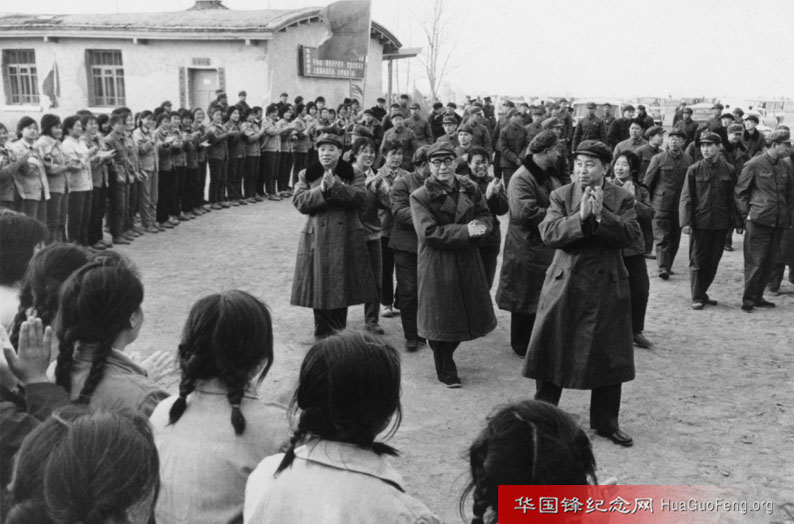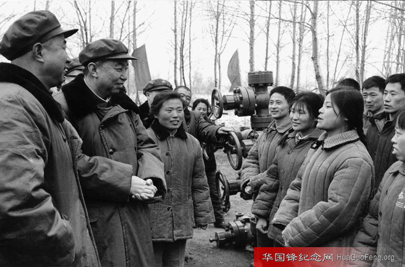 1977年4月19日,华国锋来到大庆油田机械设备检查汇报现场时,受到参加操作表演的工人的热烈欢迎。